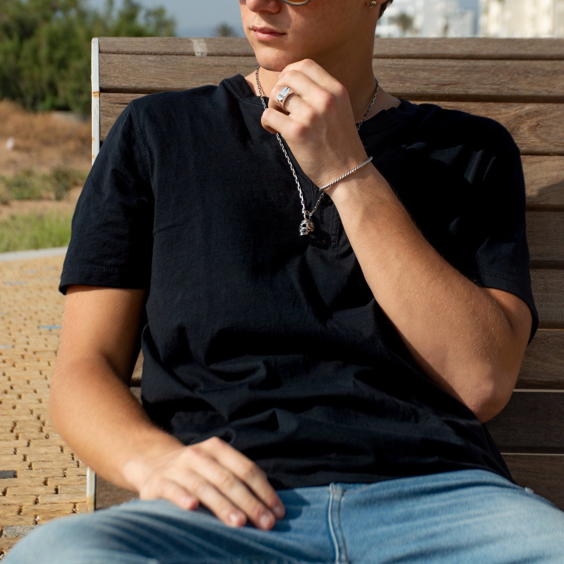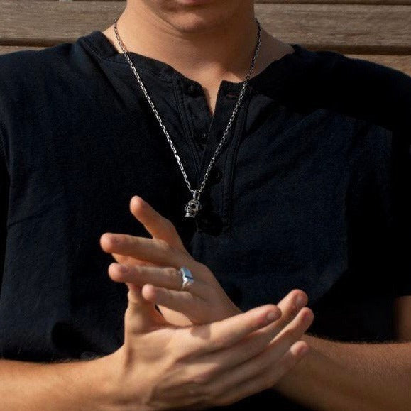 The necklace features a chunky, heavy, and massive silver anchor chain that's designed to be worn over the head. The chain's smooth, polished links and simple design make it the strongest jewelry chain.