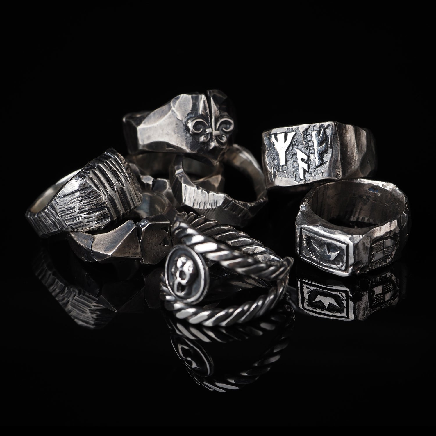Introducing our avant-garde inspired ring, featuring a simple yet bold design that showcases laconic completeness and minimalism. The ring boasts a monolithic, geometric form with carved decorative details, surrounded by a heavily polished finish that contrasts with the oxidized interior.
